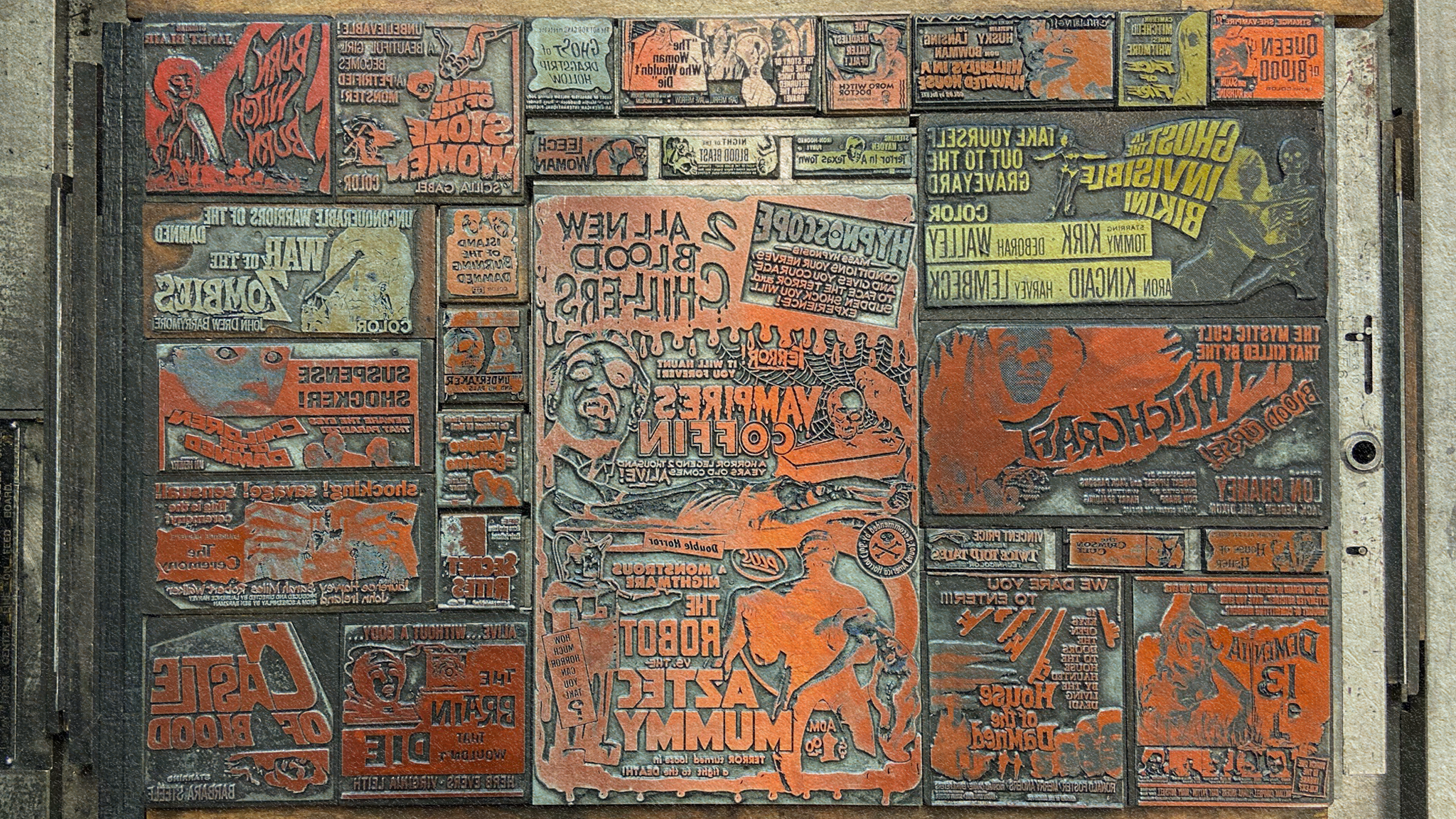 By the 1930’s, a system of simplified ads with standardized sizes based on newspaper column widths flourished. These ads became the standard for how all movies were advertised for the next 50 years. Movie studios had specialized production houses produce metal printing plates, and paper molds for the newspapers. Like the broadsides before them, the components to produce these ads were considered trash and burned, melted, or discarded once used. While the paper molds were sent out in the millions over the decades to newspapers, the metal blocks made to test their quality were thought to be immediately melted down and the wood block mounts reused over and over. Miraculously, a collection of 60,000 printing proof blocks were re-discovered in 2015 and are now being preserved by The Press Room.